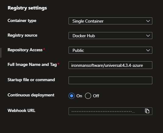 linuxFxVersion: 'DOCKER|ironmansoftware/universal:${version}-azure'