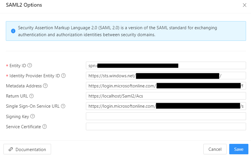Once the SAML2 integration has been added, you can configure the basic settings for communicating with your identity provider. You will need at least the Entity ID and Identity Provider Entity ID configured.&#x20;